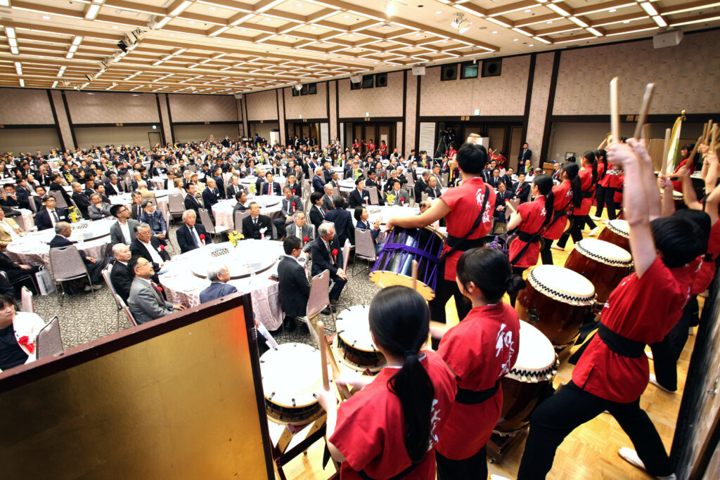 式典後に行われた懇親会では、和太鼓による力強いオープニング演奏で始まり会場が一気に華やぎました。宮地理事の開会の辞、岡山県組合 牧理事長による挨拶、全浄連会長 上田勝朗氏をはじめとするご来賓の祝辞、ご来賓紹介の後、日本環境保全協会 三条忠文会長による乾杯の発声の後、参加者同士の交流が盛んに行われ、ダンスや三味線のアトラクションなども披露され、終始温かい雰囲気に包まれました。