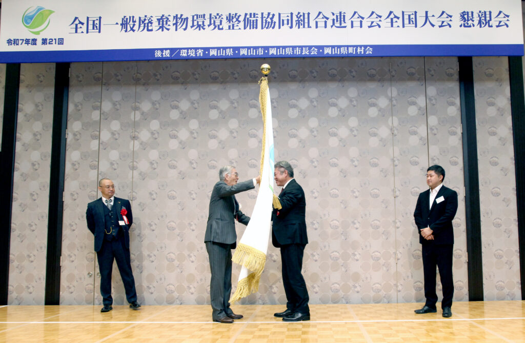 懇親会の終盤には、岡山県 牧理事長から宮崎県 岩本理事長へ大会旗が引き継がれ、次回開催地・宮崎へ想いがつながれました。